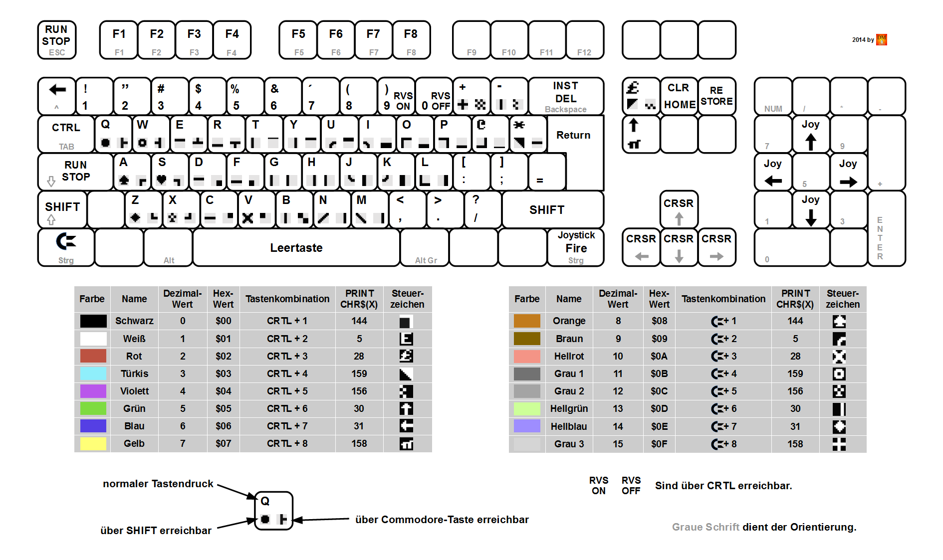 Ich empfand immer störend nicht zu wissen welches Grafiksymbol auf welcher Taste zu finden ist (beim C64 sind dies auf die Tasten zu sehen). Aus dieser Not entstand die folgende Tastaturschablone. Ich hoffe sie leistet Euch ebenfalls so gute Dienste wie mir.